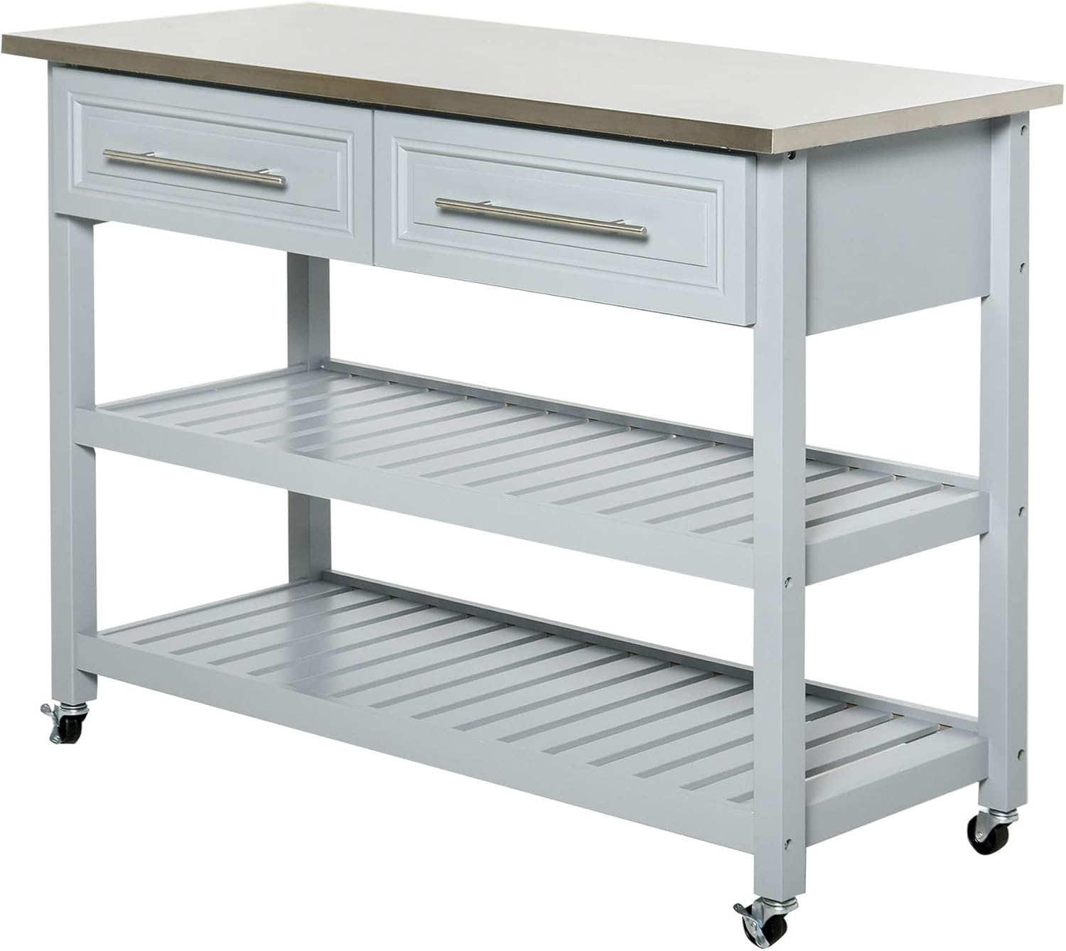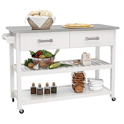 Chloe stainless steel top kitchen island/cart. Casual home kitchen island bar station with hardwood counter top, stainless steel towel rack, 1 large drawer and lower storage, white. With a simple and elegant design, this kitchen island is not only beautiful, but incredibly sturdy and functional. A stainless steel kitchen cart will bring both practical storage and trendy design to your kitchen. Comes with solid rubberwood top, 2 drawers, 2 shelves, a serving tray, and stainless steel hardware rated 4.7 out of 5 stars based on 282 reviews.